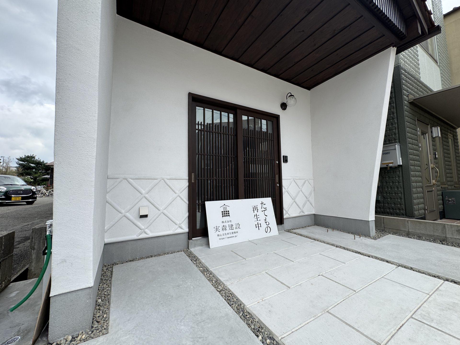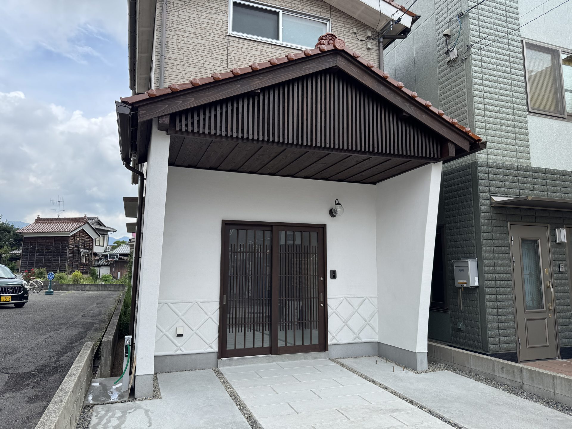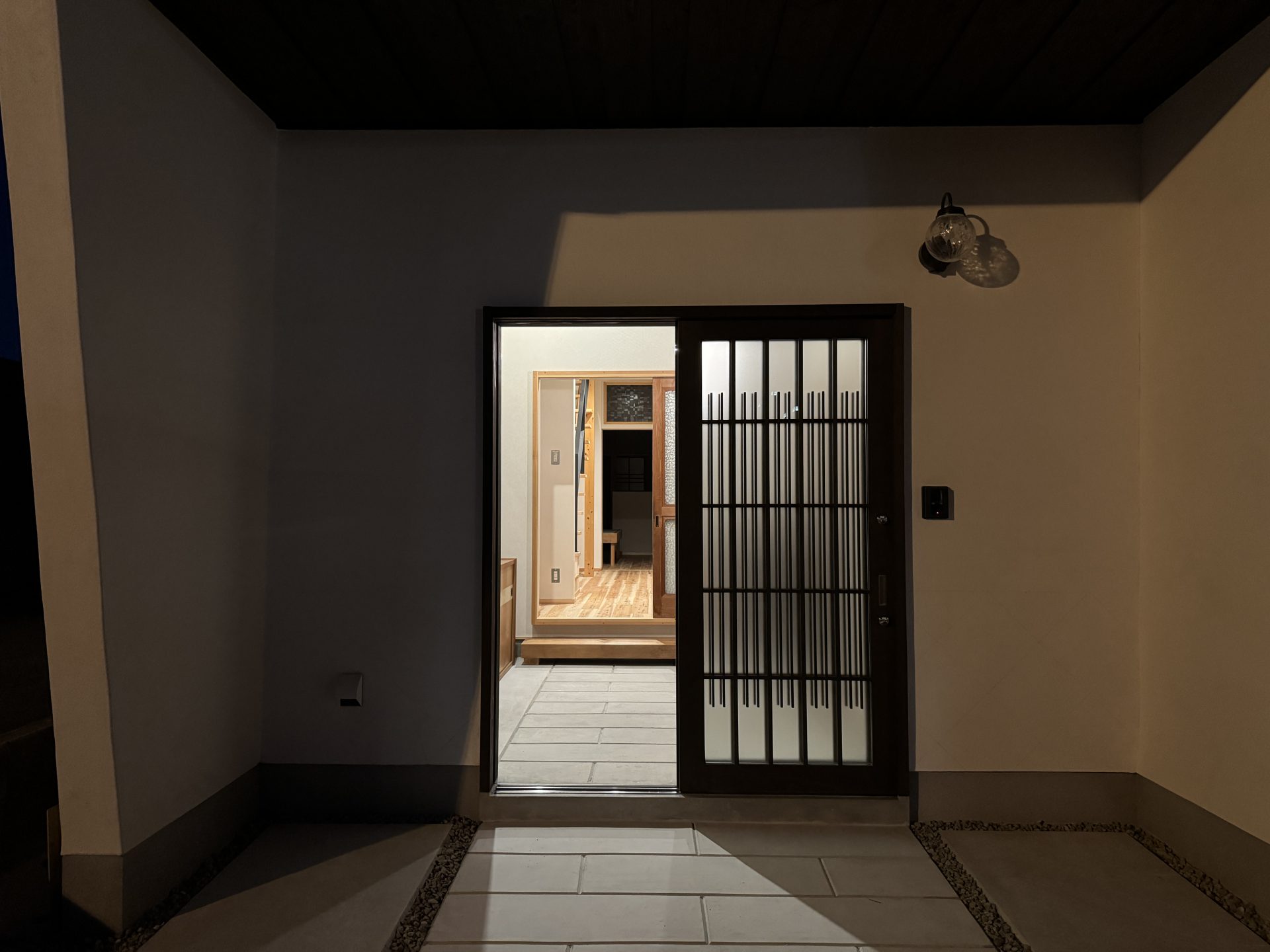 (木製玄関建具と白のなまこ壁と格子と赤瓦を再現アレンジ)